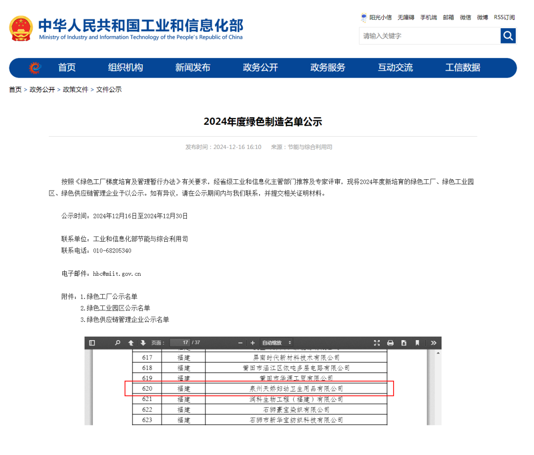12月16日,工业和信息化部公示了2024年度绿色制造名单,泉州天娇公司凭借其在环保节能、技术创新、质量管控、生产工艺优化、安全生产及社会责任等方面的卓越表现,荣获“国家级绿色工厂”荣誉称号!这一殊荣不仅是对天娇公司多年来坚持绿色发展、技术创新不懈努力的肯定,更是对天娇公司未来可持续发展之路的鼓舞与鞭策。