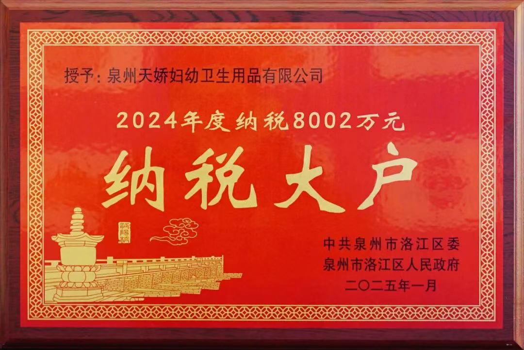 在大会表彰环节,天娇公司以年度纳税超8000万元的卓越贡献再度登榜"纳税大户"。这不仅是一份企业用心经营的成绩单,更是对公司始终坚持诚信经营、依法纳税原则的崇高褒奖。从母婴卫生用品赛道起步,天娇始终与洛江发展同频共振,以实际行动诠释了民营企业的责任与担当,以匠心品质护航全球千万家庭健康,用诚信口碑铸就金字招牌。